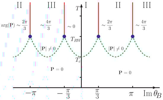 In this work, we consider the cases and , where is the Roberge–Weiss temperature [] (see Figure 2 illustrating the physical sense of ) and is, strictly speaking, the pseudocritical temperature of the chiral crossover at . The range is omitted for simplicity.