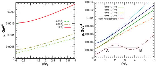 In the left panel, we see that, at the densities of the order of the saturation density, the dependence of the pressure on the net-baryon number is qualitatively the same over the range , and the values of the pressure at are taken from []; the pressure gradually decreases with the temperature. The difference between the EoSs corresponding to the two-parameter fit (Formula (24)) and the one-parameter fit (Formula (23)) at is shown in the right panel. The dark blue solid curve corresponds to the case where in Formula (24) is set equal to zero, and the cyan dashed curve corresponds to the negative value of , as was obtained in lattice simulations. It deflects upwards from the case, which is a consequence of the EoS (Formula (24)) that follows from the expansion shown in Formula (17). The physical reason for such deflection can be explained as follows. In a wide class of statistical models, such as the excluded-volume hadron resonance gas (EV-HRG) model or the CEM, the sign of the coefficients alternates, which is a consequence of the excluded volume, as was shown in []. The excluded-volume effect can be formulated in terms of the EoS as follows: the pressure of the gas of finite-volume particles increases with an increase in the density more rapidly than in the case of point-like particles. This is precisely what one sees in the case of a van der Waals gas, as well as in Figure 3.
