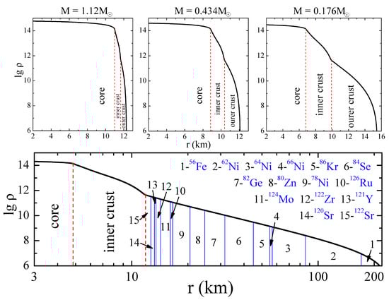 The four panels of this figure show the dependencies of the density in the NS as a function of the radial coordinate r for the BSk25 EoS []. The NS mass values for each of the upper panels are shown at the top; the lower panel corresponds to the minimum NS mass (about ). In addition, on the same panel, numbers with labels show the nuclear composition of the outer crust for this EoS (see also Table 1 below). The boundaries of the core, inner, and outer crusts are shown by vertical red dashed lines. In the NS with moderate mass ( ), the outer and inner crusts occupy only a small fraction of the star’s volume. However, as the NS mass decreases, this fraction sharply increases and the core size decreases. In the NS of minimum mass, the crust extends over more than 200 km. It is in the crust region that a shock wave is generated producing gamma radiation in the stripping model [,]; here, active nucleosynthesis (r-process) occurs accompanying the explosive destruction of the low-mass NS (LMNS) []. This is why the crust region is so important for the stripping model.