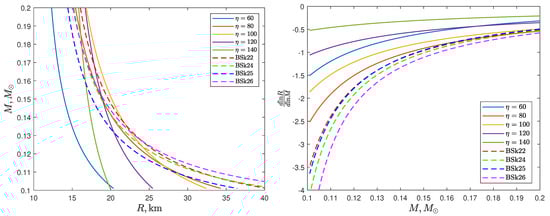 To investigate the sensitivity of the stripping time to the EoS in the low-mass region ( ), we use the parametrization of the mass–radius relations from [], shown in the left panel of Figure 2. Additionally, the dotted lines represent the curves corresponding to the latest versions of the BSk-type EoS []. The main parameter here is , which is a combination of the so-called incompressibility of symmetric nuclear matter and the symmetry energy slope parameter , poorly determined from terrestrial experiments and astrophysical observations (see, e.g., [,] for a review). Recall that these parameters enter into the expansion of the nuclear EoS near the saturation density :