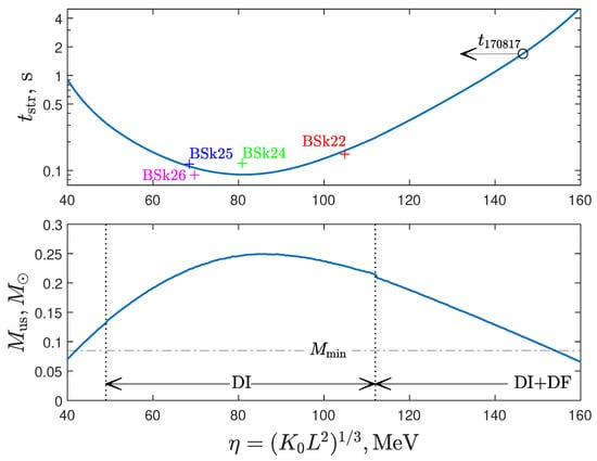Using the results described above, we performed a series of calculations for the NS-NS system with initial masses and so that the total mass agreed with the total mass of the GW170817 source []. We used the BSk22 EoS for the massive NS, and the parametrization — for the LMNS. Accretion spin-up was taken into account in all calculations. Figure 3 shows the dependence of the stripping time and the mass of the low-mass component (unstable), at which the mass-transfer stability is lost, on the value of the nuclear parameter . The horizontal dash-dotted line on the bottom panel corresponds to the minimum NS mass (see, e.g., []). We exclude the values of and , which give non-physical results . The DI region corresponds to the direct impact accretion of matter on the surface of the massive component, and DI+DF corresponds to the successive change of accretion modes and the accretion disk formation at the final stages of the stripping process. Crosses indicate calculations with the BSk EoS for the low-mass component. A comparison of Figure 3 with Figure 2 shows that, as we assumed, for the flatter mass–radius relations, the mass-transfer stability is lost for large and corresponds to small .