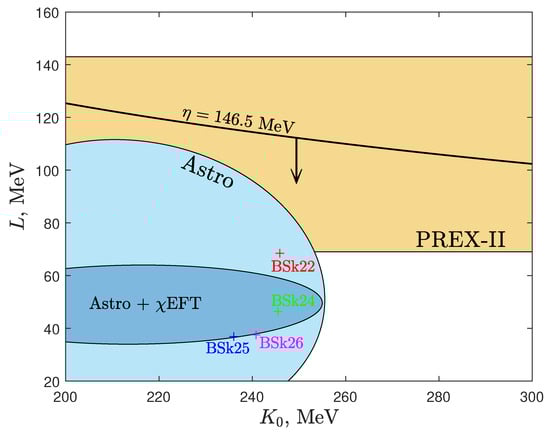 The identification of the GW170817-GRB170817A event in the framework of the stripping model [,] allows us to impose an important limitation on the nuclear EoS parameters near the saturation density point from (11). Let us look at Figure 3 again. The circle on the top panel corresponds to the observed stripping time , corresponding to the time delay between the loss of the GW170817 signal by the LIGO-Virgo GW interferometers and the registration of the GRB170817A [,]. A comparison of the calculated and observed values of allows us to find the nuclear parameter . The value of obtained in this way is the upper bound because in our calculations with the formula (3) we neglected the effect of tidal spin-down of the massive component, which slightly increases the duration of the stable mass transfer (see []). As discussed above, we perform calculations with initial masses and . At the same time, the generation of the GRB during the explosion of the minimum NS mass after the loss of the mass-transfer stability (at ) should also take some extra time []. All these processes should increase the stripping time and correspondingly reduce the real value of . The constraint on the range of parameters is shown in Figure 4. The yellow area illustrates the limitations according to the PREX-II experiment []. In this important experiment, the neutron skin thickness of , which correlates with the NS radius and the symmetry energy slope parameter L [], was determined for the first time in a model-independent way. The blue area (Astro) corresponds to the results of processing various astrophysical observations related to determining the NS masses and radii []. The blue ellipse combines astrophysical observations with the constraints on the NS EoS from the chiral effective field theory, (see also [] for a review). The plus signs denote the values of L and for the BSk-type EoS [].