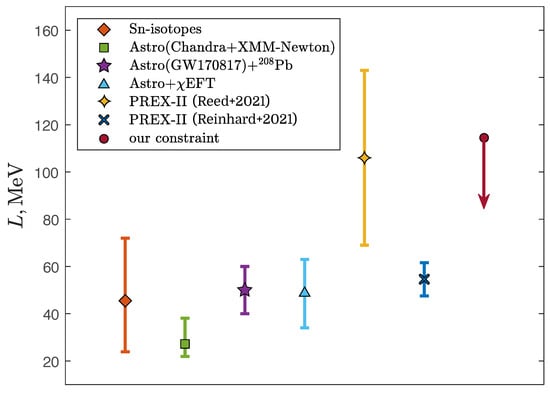 Having the generally accepted value of the incompressibility of symmetric nuclear matter (see, e.g., []), we obtain (see Figure 5). The colored symbols (together with the corresponding error bars) represent the results of the Bayesian analysis of various terrestrial experiments and astronomical observations. The orange rhombus denotes the result of processing model-dependent measurements of the neutron skin thickness of tin isotopes (Sn-isotopes) []. The green square corresponds to the limitation from observations of low-mass X-ray binaries with the Chandra and XMM-Newton telescopes [], and the purple five-pointed star is obtained from the analysis of the GW170817 signal, combined with data from various experiments to measure the neutron skin thickness of lead []. Figure 5 clearly shows a significant discrepancy between the results of the mentioned PREX-II [] experiment (the four-pointed asterisk) and the entire set of astrophysical observations [] (the blue triangle), as well as the other terrestrial experiments. However, we note that an alternative analysis [] of PREX-II gives significantly lower value of L (the blue cross), which appears to be consistent with other estimates. It can be seen that our constraint on L (the burgundy circle) agrees with all the data presented. The subsequent consideration of the general relativity effects and non-conservative mass transfer discussed in [] will make it possible to refine this estimate.