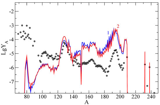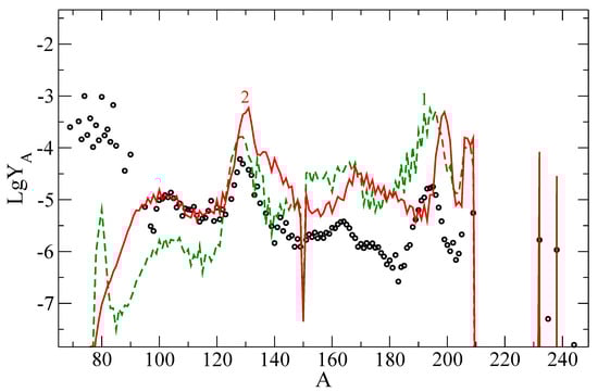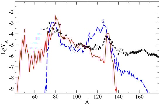 As a result of nucleosynthesis, elements in the outer crust are mainly formed in the range of mass numbers from to for both considered EoSs. As can be seen, the integral results on the abundance obtained by modeling the explosion of the LMNS [,] using different EoSs (BSk22, BSk25) differ markedly, especially in the region of the cadmium peak.