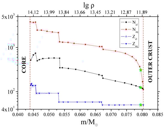 In the figure, the values of the following quantities are given as functions of the mass coordinate m in the inner crust of the NS. The blue triangles show , the cluster charge, and , the total charge of the Wigner–Seitz cell, coinciding with almost everywhere, except for the inner boundary of the crust (near the NS core). The black squares show , the number of neutrons bound in the cluster. The red circles are the total number of neutrons in cell , both free and bound. The corresponding density values are given on the upper axis.