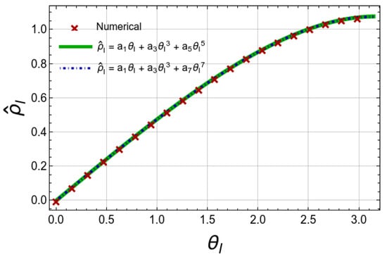 where is the distance between adjacent LYZ on the real negative semiaxis. We found that Equation (24) is nicely satisfied at [25] when only terms up to were used in the approximation of the density . Here, we check it for with approximated by Equation (5). Using Equation (5) we derive for