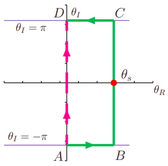 The sum of the first and the third terms in Equation (10) should be omitted for the following reason. The baryon number density and, therefore, are holomorphic functions over the interior of the rectangle and, to employ the stationary phase method, we should keep them continuous over the rectangle with its boundary (the periodicity of the baryon-number density under consideration requires that discontinuities emerge along the lines and ). Thus, we have to choose the values on the segments and as limiting values when tends to the boundaries and from the interior of the rectangle so that is continuous and thus non-periodic. This being so, on and on , where are given by formula (13). It is evident from Equation (13) that . This means that the first and the third terms in the upper row of formula (10) do not cancel each other, their sum is the product of the exponent and the rapidly oscillating function . Thus, the sum of integrals is purely imaginary and can be omitted since the integrals both in the numerator and denominator of formula (8) are real. Therefore, the sum just cancels the imaginary part of the integral .