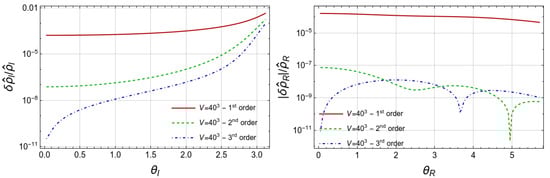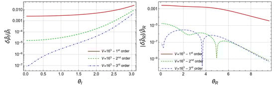and compared them with input densities (6) and (5). We present respective relative deviations in Figure 3, Figure 4 and Figure 5. One can see from the left panels of Figure 3 and Figure 4 that the relative deviation of is substantially reduced when we improve the approximation for from the first approximation to the third approximation. We should note that we did not include the very vicinity of in these figures. When is very close to , the functions (5) and (22) are intrinsically different for any finite volume. The agreement between the input and approximated becomes even better when we move from to , as follows from comparison of Figure 3 and Figure 4. This effect is emphasized in the left panel of Figure 5.