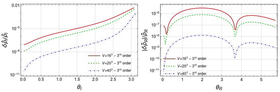 For the relative deviation of shown in the right panels of same figures, we see qualitatively the same behavior with some differences. The second and third approximations provide more or less the same precision, which is much better than the precision of the first approximation. Increasing the volume also improves precision very much.