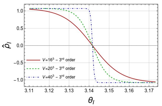 Behavior of the baryon number density for the imaginary chemical potential computed via Equation (22) near the for three volumes and best (third) approximation for .