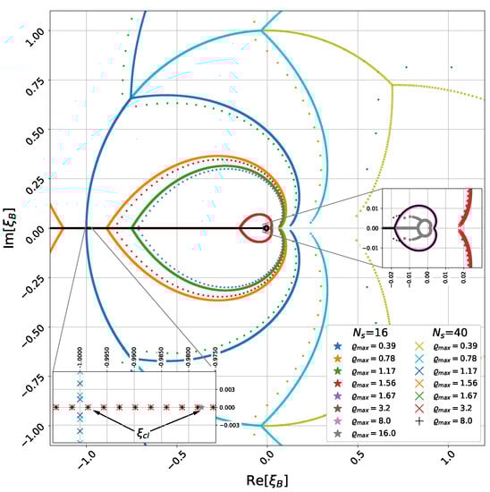 In Figure 7, the results for LYZ are presented in the complex fugacity plane for two volumes with and several values of for each volume. The general features of the LYZ distribution are very similar to those observed before in Ref. [25] for temperature . In the bottom insertion of this figure, show real LYZ nearest to . One can see that the positions of these LYZ do not depend on but depend on . The main difference from the results obtained for is the appearance of additional LYZ branches for for and a bit later for smaller volumes; they can be seen in the right insertion of Figure 7. The reason for the branches is not yet completely clear. We can see few such reasons: the insufficient numerical precision in the computation of LYZ, the approximation made in Equation (20) for , or the approximation for the baryon density in Equation (5).