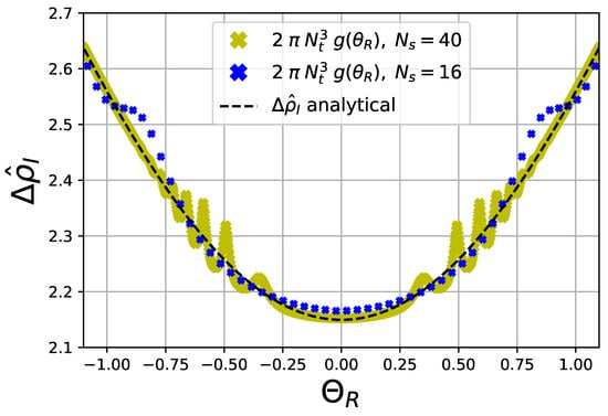 Our results for the lhs and rhs of Equation (24) are presented in the Figure 8. One can see that the numerical value of the discontinuity agrees quite well with the analytical prediction at small and large . In the intermediate region, we observe a discrepancy with the analytical prediction in the form of oscillations. The maximum of this discrepancy is observed near . By comparing the results for two volumes, one can conclude that with increasing volume the amplitude of the oscillations is increasing but the range of where they are observed is decreasing. Let us note that we observed similar behavior for the density , though less pronounced, for the case of Equation (3), but in the limit of large volumes such oscillations disappeared. The reason for these oscillations is still to be clarified.