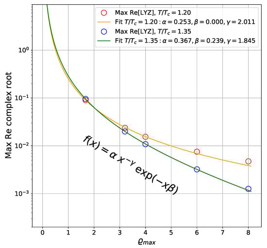 Behavior of the real value of the most right complex LYZ located on a small loop near as a function of the maximum density for temperatures and 1.20. The lines show results of the fit to the function (28).