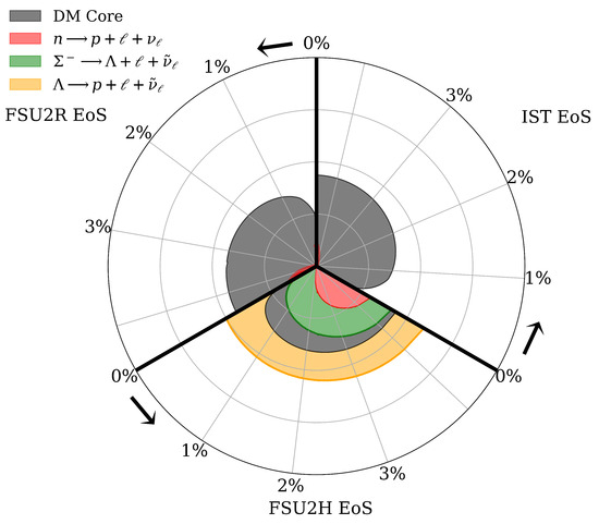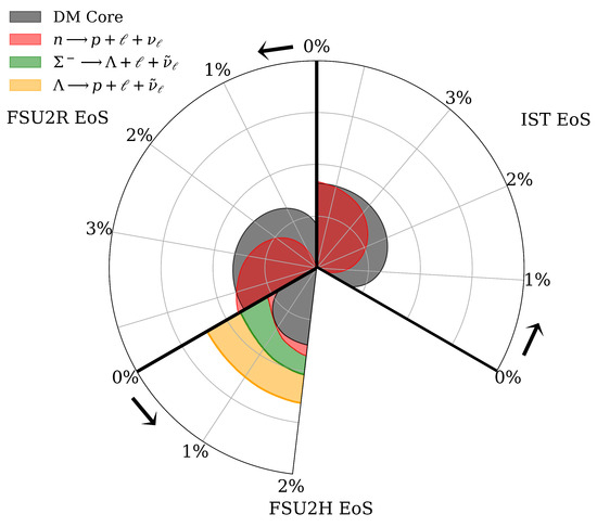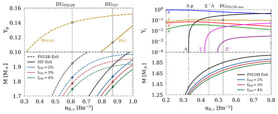 For a comparison, Figure 4 shows stars of M⊙ described with the same models as in Figure 3. In the case of the FSU2H EoS, not only the hyperonic DU processes but also the nucleonic DU are activated. Moreover, as it can be seen in Figure 4, no DM-admixed configurations with a DM fraction higher than 2% exist in this model. This is related to the FSU2H EoS that has an upper limit on the baryonic density, fm−3, at which the effective nucleonic mass vanishes [44]. As higher DM fractions require higher central baryonic densities, which cannot be obtained within the FSU2H EoS, such configurations do not exist.