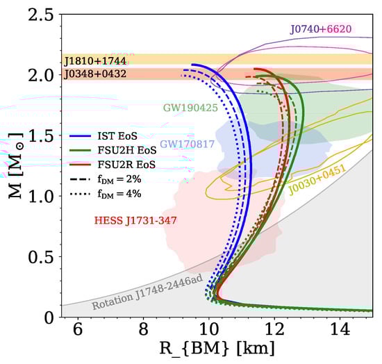 Figure 2 shows the solid M-R curves for baryonic stars described by the IST, FSU2R, and FSU2H EoSs in blue, red, and green, respectively. The dashed and dotted curves represent the DM-admixed configurations with DM fractions of 2% and 4% for the corresponding BM EoSs.