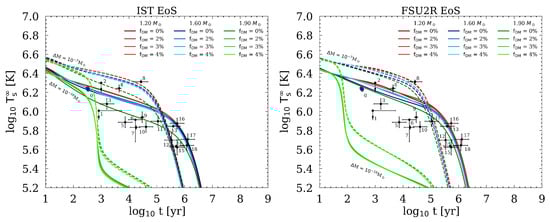 On both panels in Figure 5, the cooling curves for the 1.9 stars with 0% of DM show a slow cooling, corresponding to the absence of the DU process. However, an accrued DM of GeV of (IST EoS) and (FSU2R EoS) triggers the previously forbidden process to operate. Thus, the green curves for and exhibit a rapid drop of the surface temperature.