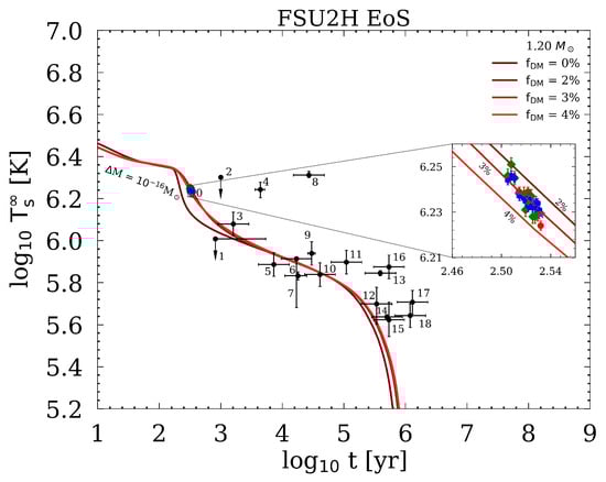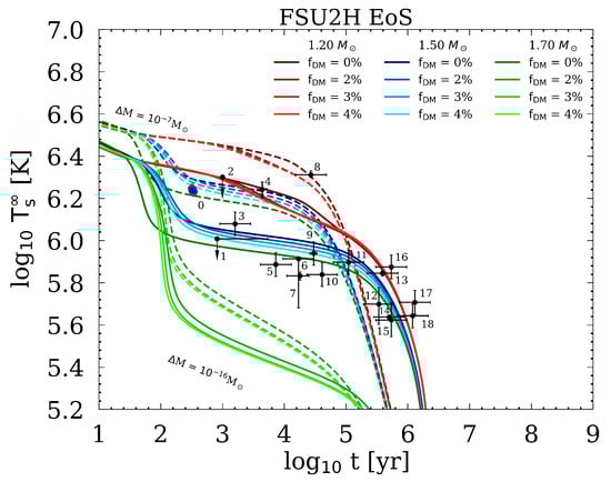 As seen in Figure 6 the FSU2H model provides a good agreement with the observational data that fully agrees with the results of Ref. [124]. For the pure BM star of 1.7 only the DU process operates leading to a medium cooling. At the DU process onsets causing a rapid temperature drop, while the DU process takes place for much higher DM fractions (see light green curves in Figure 6).