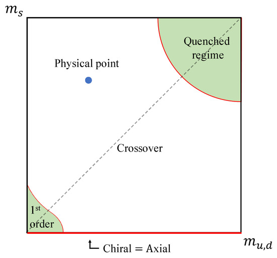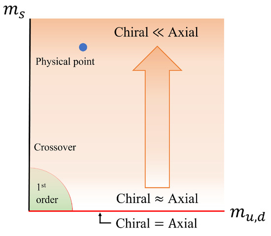 With those preliminaries, we may now pay attention to the Columbia plot to consider the quark mass dependence on the symmetry restoration. Figure 1 shows the conventional Columbia plot where the QCD phase diagram is described on the – plane. As a result of Equation (22), the chiral symmetry is simultaneously restored with the axial symmetry on the -axis.