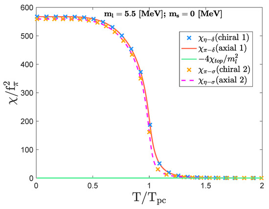 Once the strange quark gets massive, the topological susceptibility takes a finite value and interferes with the meson susceptibility functions through Equation (21). The simultaneous restoration for the chiral and axial symmetries is controlled by the strange quark mass through the interference of nonzero . Thus, with the large strange quark mass (), the chiral restoration significantly deviates from the axial restoration above the (pseudo)critical temperature: