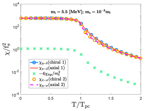 Of interest is that the susceptibility functions for the chiral symmetry, the axial symmetry, and the topological charge are merged into a single equation. Therefore, Equation (21) is valuable in considering the nontrivial correlation between the symmetry breaking and the topological feature in the susceptibility functions. In particular, it is shown that the difference between the indicator for the chiral symmetry breaking strength () and the indicator for the axial symmetry breaking strength () corresponds to the topological susceptibility.