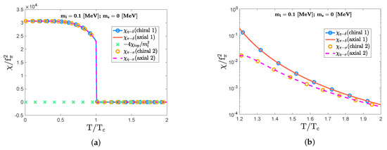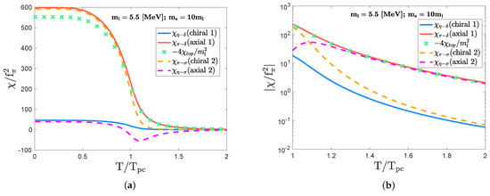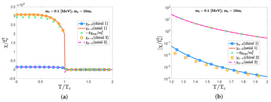 As increases, the topological susceptibility further grows, and starts to significantly contribute to the chiral and axial indicators following the correlation form in Equation (21). Actually, when the strange quark mass takes , the topological susceptibility () becomes on the same order of magnitude of and in the low temperature regime: for . This trend is depicted in panel (a) of Figure 5 for . Thus, the sizable discrepancy between the chiral indicator () and the axial indicator () for is due to the interference of . As the temperature further increases, the susceptibilities go to zero. However, a sizable discrepancy still appears between the chiral and axial indicators: and for , as depicted in panel (b) of Figure 5. This indicates that the large strange quark mass providing the significant interference of the topological susceptibility urges a faster restoration of the chiral symmetry for .