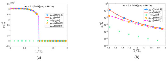 The plots clarifying the significant interference of the topological susceptibility to make the sizable discrepancy between the chiral and axial indicators in the crossover domain with the large strange quark mass ( MeV and = 10 ; MeV) for (a) and (b) . The manner of scaling axes is the same as in Figure 2.