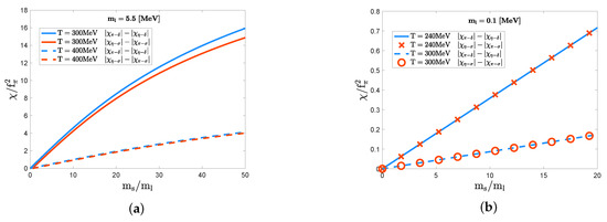 Note that, in the chiral limit, we encounter the infrared divergence in the pseudoscalar-meson susceptibilities due to the emergence of the exactly massless Nambu–Goldstone bosons. The nonzero light quark mass thus plays the role of a regulator for the infrared divergence, making them well-defined. The differences of the susceptibility functions of the mesons forming the chiral and axial partners, , , , and , can safely serve as well-defined indicators for the symmetry breaking of and .