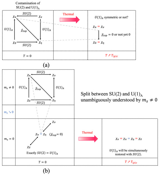 The anomalous chiral-Ward identity in Equation (20) relating the topological susceptibility to the pseudoscalar meson susceptibility functions has often been used to measure the effective restoration of the axial symmetry in the chiral symmetric phase so far. The restoration probed by the topological susceptibility has been studied extensively in the chiral effective model approaches [33,34,35,36,37,38,39,40,41,42] and the lattice QCD frameworks [9,10,43,44,48] to explore the origin of the split in restorations of the chiral symmetry and the axial symmetry. This ordinary method is summarized in panel (a) of Figure 11). However, this ordinary approach suffers from practical difficulty in accessing the origin of the split without ambiguity because the chiral symmetry breaking is highly contaminated with the axial symmetry breaking even at the beginning, at the vacuum.