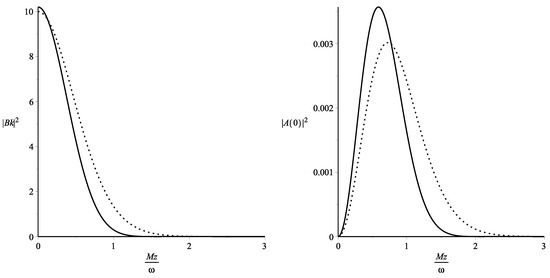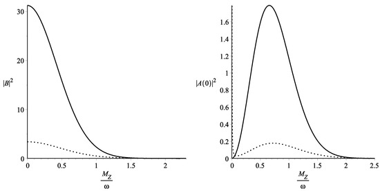 Figure 1 and Figure 2 show the variation of the probability density with the parameter and prove that the process of Z boson emission is important when the Hubble parameter is larger than the mass of the boson. Another consequence of the graphs is that the probability is finite and non-vanishing for and also for or . The ratio used in our graphs must be understood as and we observe that the probability is non-vanishing as long as the energy of the background is larger or has the same order as the rest of the energy of the Z boson. This result corresponds to the well-established knowledge that places the Z bosons production in the early universe. Our graphical results for the probability prove that in the Minkowski limit , the probabilities are vanishing, and this result can also be obtained by taking the limit in Equations (12) and (13). We can conclude that the process of Z boson emission by a neutrino is possible as a perturbative process only in early universe when the expansion factor is much larger than the Z boson mass.