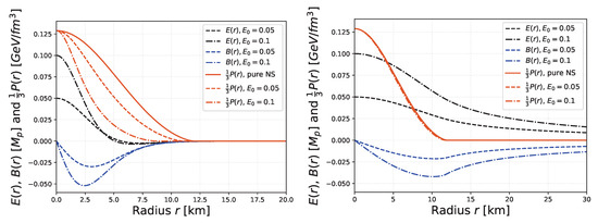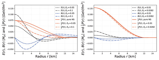 In Figure 1, we show radial profiles of the pressure (orange) and the vector field components (black), (blue) of the zeroth mode of different FPSs with potential Equation (22). In the left panel, we take a boson mass of eV and an interaction strength of . The FPSs have varying central vector field amplitudes and central densities of . Here, we take g/cm3 to be the nuclear saturation density, with being the neutron mass and fm−3 the average nuclear number density. The radial profile of a pure NS is shown with the orange continuous line and has no corresponding vector field (because it would be zero everywhere). The presence of the DM can be seen to compactify the NS component with increasing central field amplitude . The field forms a DM core configuration.