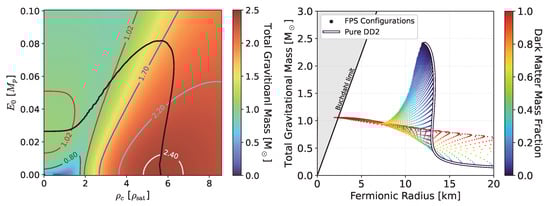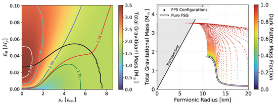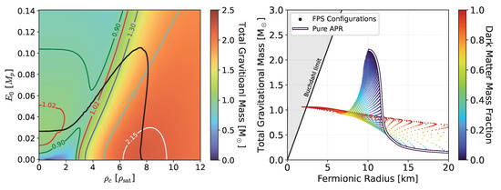 After integrating the solution to radii outside the matter sources (i.e., where ), we can extract global observables such as the total gravitational mass and radius. The outside of the source is located at radii r larger than both the fermionic radius and . In this regime, neither the NS matter nor the vector field contribute significantly. There, we can extract total gravitational mass Equation (17) and then compute integrals Equations (16a) and (16b) to obtain the fermion/boson numbers , .