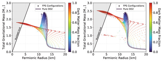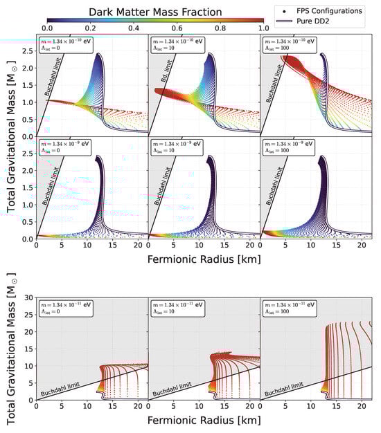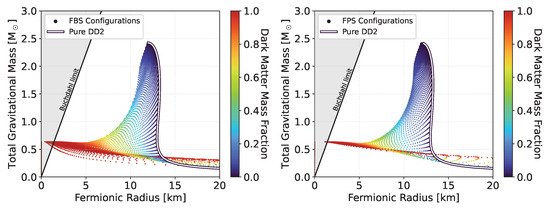 denotes the fermionic radius (i.e., the radius of the NS component). It is defined by the radial position at which the pressure P of the NS component reaches zero. It is also possible to define the bosonic radius . It is defined as the radius where of the bosonic restmass (see Equation 16b)) is contained. Using these definitions, we gain the ability to discriminate between DM core and cloud solutions. Core solutions have and cloud solutions have . The total gravitational mass is defined in the limit of large radii, imposing that the solution asymptotically converges to the Schwarzschild solution