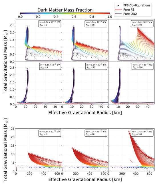 We consider FPSs with a quartic self-interaction potential of the same form as in Equation (22). We further define the effective self-interaction parameter m2. The parameter is a useful measure for the self-interaction strength and parametrizes scaling relations for the total gravitational mass /m [75] (for small ) and /m [84] (for large ). These scaling relations and numerical pre-factors can be derived numerically by fitting the configurations of maximum mass for a given m and to postulated scaling behaviors. Note that parameter was originally introduced in the context of pure Proca stars and thus the scaling relations will not be generally valid for the mixed system. They can, however, be useful to understand the limiting cases where the FPS is dominated by the bosonic component. Nonetheless, we regard to be a useful measure to compare different choices in the mass and self-interaction strength. The self-interaction parameter in our work differs from the one used in [84] by a factor of two, even though they are defined in the same way. This is because a different normalization technique was used for the vector field.