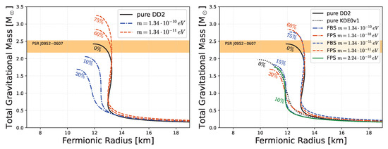 The idea that an astrophysical object consists of a mixture of fermionic and bosonic matter goes back to [27,28]. A multitude of different models of these fermion boson stars (FBSs) have since been investigated (see, e.g., [18,29,30,31,32] for reviews). In the simplest case, the fermionic and bosonic components interact only gravitationally through the effects of their matter–energy content and without an explicit coupling (i.e., they are minimally coupled). This makes FBSs interesting objects in the context of DM research (see, e.g., [15,33,34]). They have been studied in connection to NSs, where the NS provides the fermionic component and a bosonic field provides the bosonic component of the FBS [15,33]. The bosonic component can be modeled via, e.g., scalar and vector fields. Another possibility is to study the bosonic field as a fluid or gas of particles. Which treatment is used depends mainly on the mass range of the supposed DM particle. With DM masses above the scale, it is treated as a collection of particles or as a fluid. For DM masses , the correlation length becomes larger than the average particle separation. Dark matter is then best described as a macroscopic wave. We follow the second approach in this work. We refer to [35] for a review of observational prospects of DM at different mass scales.