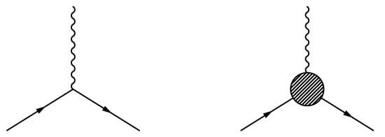 where represents the electromagnetic current Heisenberg operator of the muon, (in QFT) is the amplitude of the full on-shell vertex diagram to the right of Figure 1, and and are the spinors associated to the incoming and outgoing muon, respectively.