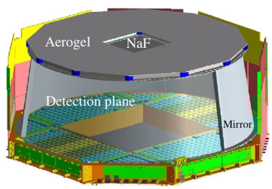 The RICH detector [24,25,26] (see Figure 1) features a truncated conical shape with a 60 cm top radius, a 67 cm bottom radius, and an expansion height of 47 cm. The detector comprises a radiator plane, an expansion volume, and a photo-detection plane. The double radiator plane includes a central radiator consisting of 16 tiles of sodium fluoride (NaF) measuring 8.5 × 8.5 × 0.5 , with a refraction index of 1.33. It is surrounded by 92 silica aerogel tiles measuring 11.5 × 11.5 × 2.5 and having a refraction index of 1.05.