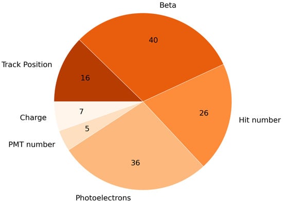 Since the Random Forest method is the best-performing selection technique among the ML algorithms compared in this work, the set of features selected by this method will be described in more detail. As shown in Figure 4 and in Table 1, all features in the “Charge” and “Track Position” classes were selected by the Random Forest algorithm. A fraction of 80% of the features was chosen for the “PMT number” class, and a similar percentage of 77.8% was selected from the “Photoelectrons” class. The classes “Beta” and “Hit number” had the lowest feature selection percentages, with 32.5% and 26.9%, respectively.