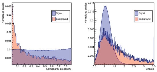 Variables belonging to the “Charge” class are indirectly influenced by the same processes. For example, the charge of the reconstructed particle is often higher for background events than for signal events (see Figure 3) due to the inclusion of additional hits in the reconstructed Cherenkov ring and the feature’s distribution for background events is more shifted towards high charge values. Likewise, the Kolmogorov probability, which also belongs to the class ”Charge”, shows values for background events on average lower than for signal events since the charge distribution along the ring is not uniform (see Section 3.1).