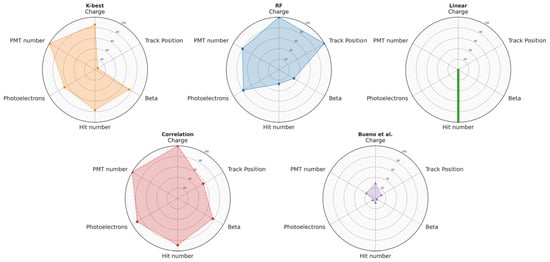 Figure 4 presents a visual comparison between the selected methods for the identified classes (Charge, Track Position, Beta, Hit number, Photoelectrons, and PMT number). Each method is represented in an individual graph: the values on the radial axes represent the percentage of selected features for each class in relation to the number of features originally contained in the same class, allowing a quick and comprehensive comparative analysis of the selected features of each method in the different classes. Furthermore, Table 1 complements this visual representation by listing the number (and percentages) of the features selected for each class by each technique.