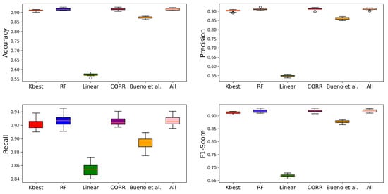 Boxplots showing the accuracy, precision, F1-score, and recall for the different selection algorithms used.