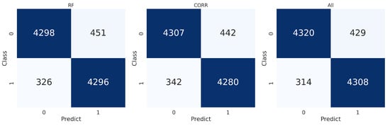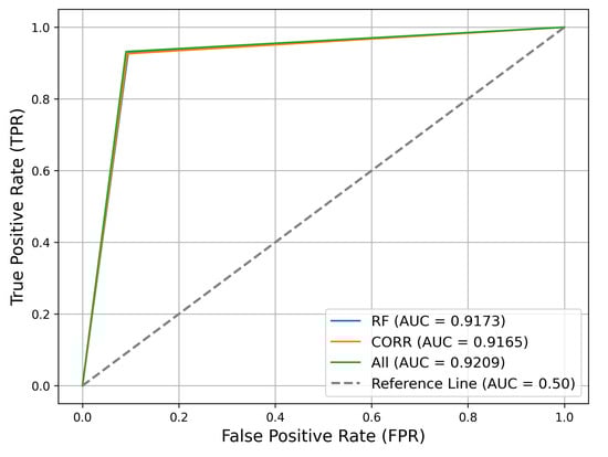 To evaluate the implemented models, the validation database previously separated was used to evaluate the implemented models. It is worth mentioning that the validation database contains data that were not used in training and, therefore, are unknown to the models. Figure 6 presents the ROC-AUC metric of the RF and correlation techniques compared to the “All” approach, using all features. Additionally, Table 5 provides the values of all metrics for better cross-technique analysis.