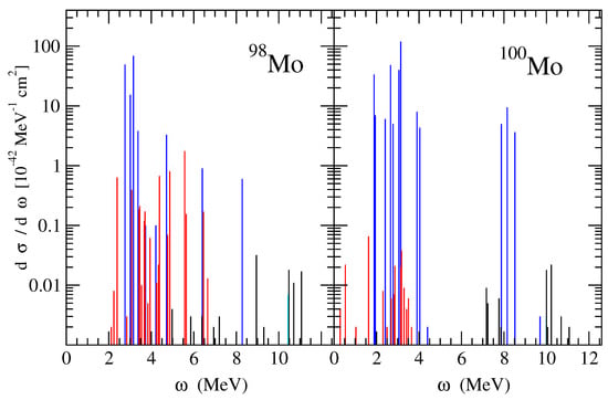 The differential cross–section as a function of the excitation energy for 98,100Mo at incoming neutrino energy MeV for different excited states. The data are taken from ref. []. The contribution of the excitation to the state is represented by blue, to by red, to by cyan, and to by black.