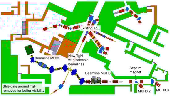 Layout of the new TgH target station and the HIMB beamlines MUH2 and MUH3. Blue, yellow, and red modules in the HIMB beamlines represent magnetic dipoles, solenoids, and magnetic quadrupoles, respectively. (General concept only; may not include details or revisions).