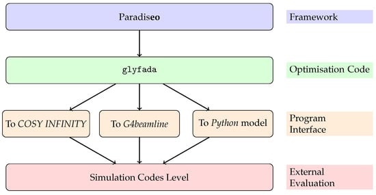 Conceptual diagram showing the optimiser in relation to the Paradiseo optimisation framework that it is based on as well as its interfaces with the simulation codes used to evaluate the objective function.