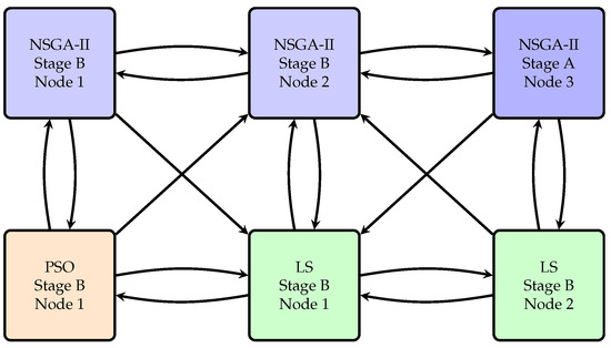 Illustration of the heterogeneous island model concept with EO algorithm, NSGA-II, PSO, and LS. In this example, the algorithm state is primarily in Stage B, with one Stage A node, demonstrating dynamic multistage execution. Arrows between islands represent the periodic migration of individuals.