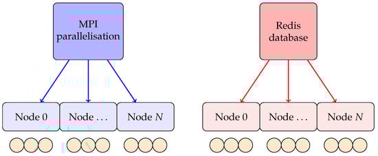 The diagram on the left shows hybrid parallelisation using MPI for inter-node communication and OpenMP for intra-node parallelism. The diagram on the right illustrates the use of a Redis database for asynchronous inter-node communication combined with OpenMP. The orange circles below the nodes represent OpenMP threads.