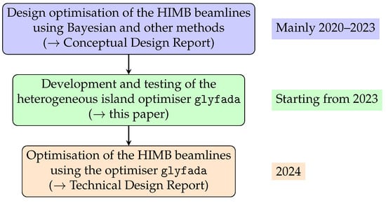 Timeline of the HIMB beamline optimisation process from the perspective of this paper: initial design optimisation (see, e.g., [,,]), mainly using Bayesian methods (blue); development of the optimiser (green); and planned HIMB beamline optimisation using (orange). The arrows (“→”) roughly indicate correspondence to a publication.