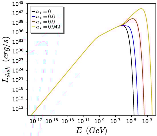 For the above parameters, we calculate the luminosity of the disk () as a function of the photon energy of the disk’s black-body spectrum, which is depicted in Figure 1 for various values of the dimensionless spin parameter . As can be seen, the luminosity becomes significant for larger energy values as increases. This occurs because as increases, the becomes smaller, so the disk’s inner radius () is located at a smaller radius where its temperature is higher. As a result of this, the black-body spectrum of the accretion disk increases.