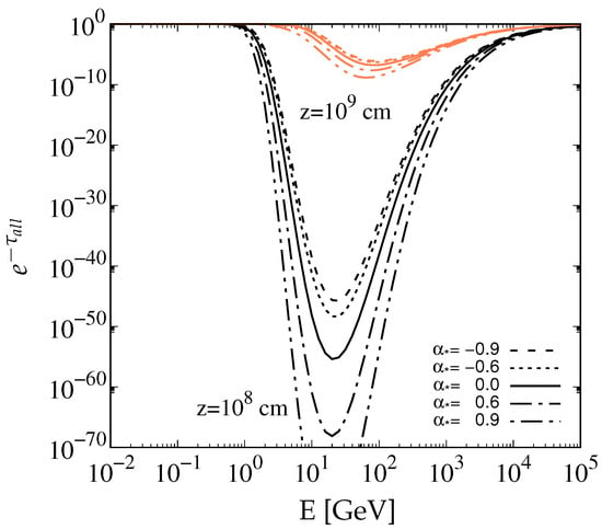 For these parameters, we now calculate the exponential of minus all the optical depths that are found in Equation (24), which is shown in Figure 2. What we can see is that the larger the spin parameter, the larger the absorption, and when we go to negative values of , the absorption is even smaller.