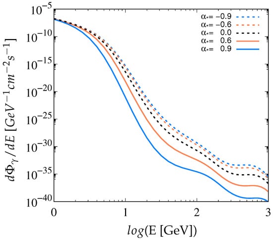 Considering a leptonic model, the radiation emission is produced by synchrotron emission from accelerated jet electrons and protons, and inverse Compton scattering [] between disk photons and jet electrons. We have calculated the differential flux after absorption. It is depicted in Figure 3. We observe that the larger the spin, the lower the differential flux, while for negative values of , the differential flux is larger.